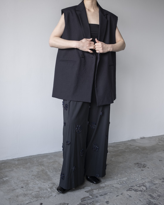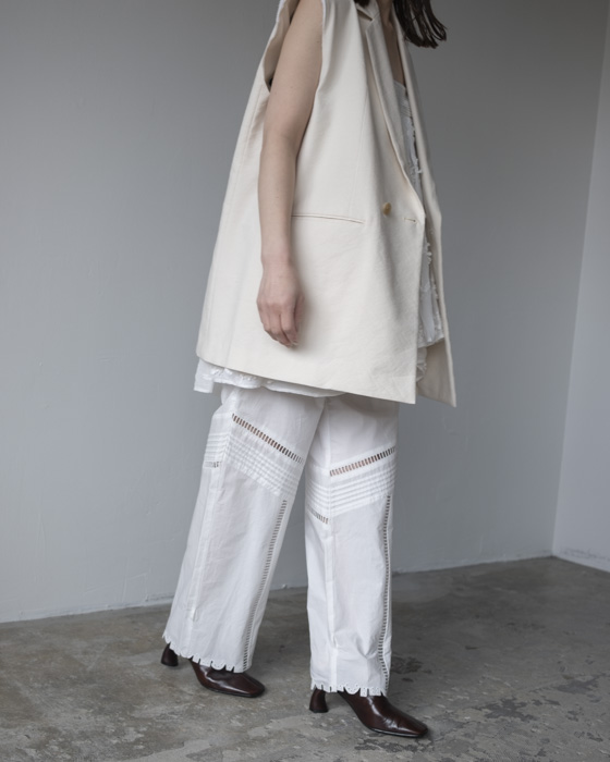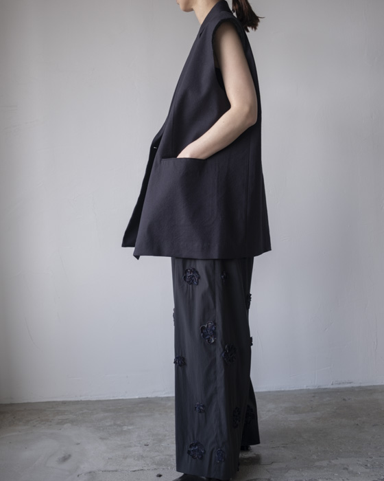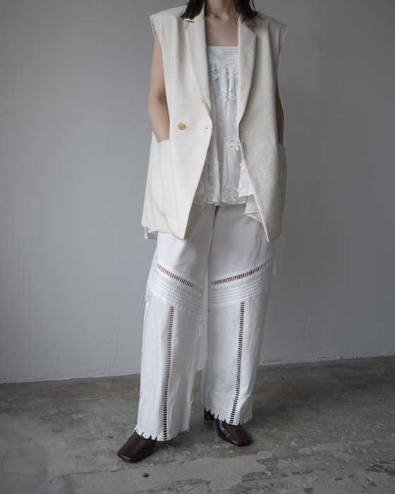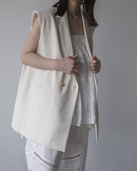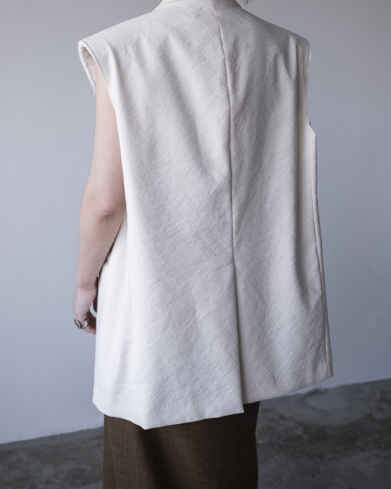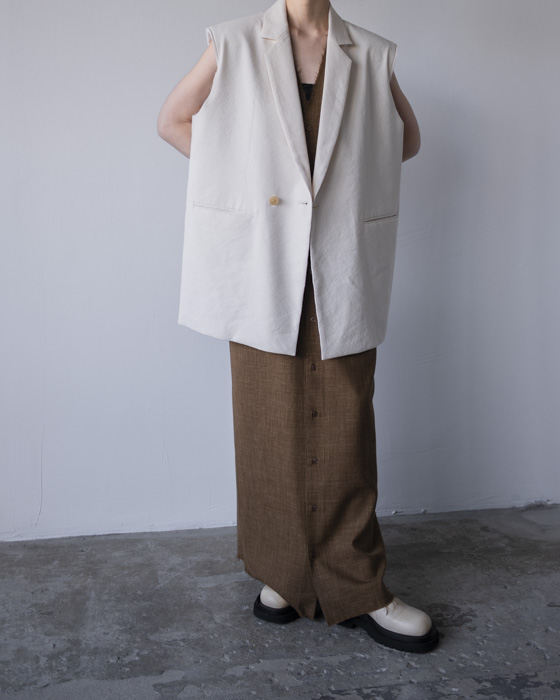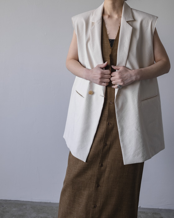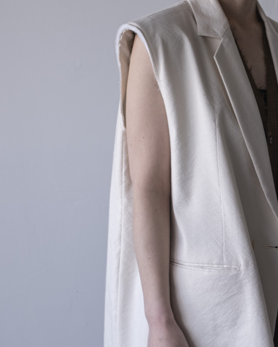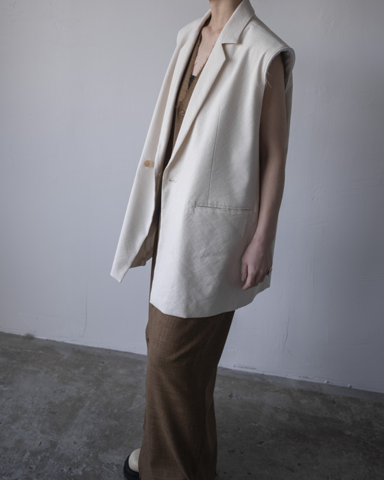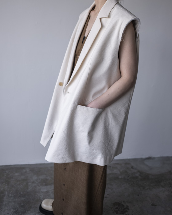 素材は、リネンに特殊な芯をボンディングした素材はリネンの特有の風合いは残しつつもシワにならないようにハリがある、クールさを演出。