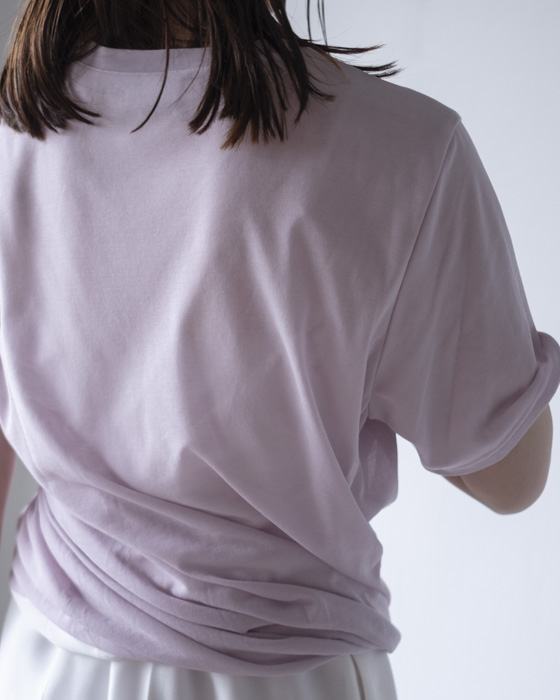 ファブリックは、綿の繊維断面のよじれを加工により、丸くリラックスさせることで生まれる独特の風合いのシアー天竺になります。