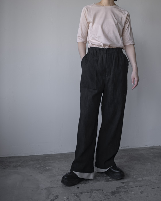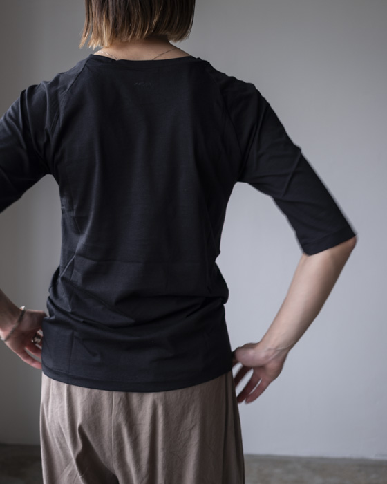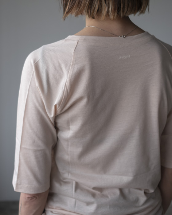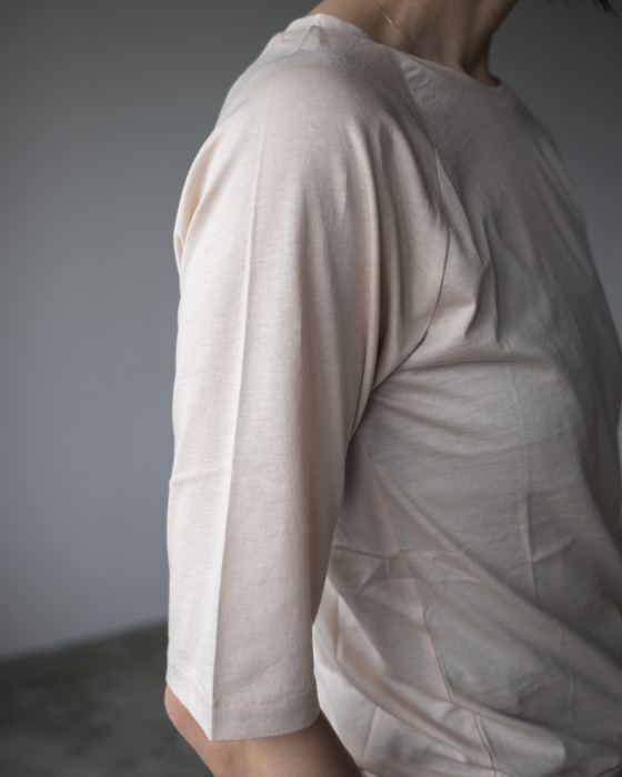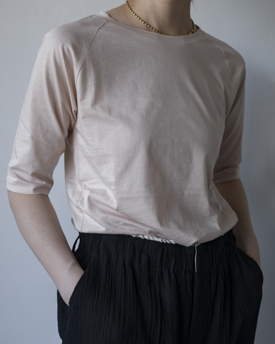 半袖にし、首元もクルーネック寄りに調整することで、よりラフに着られるバランスにしています。