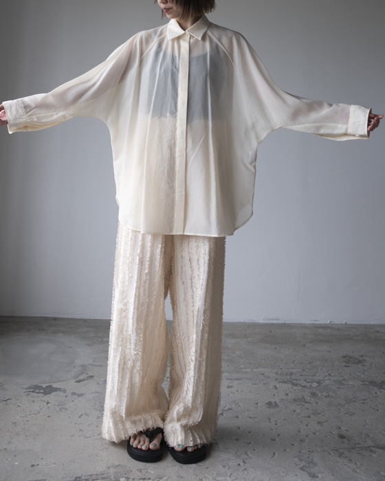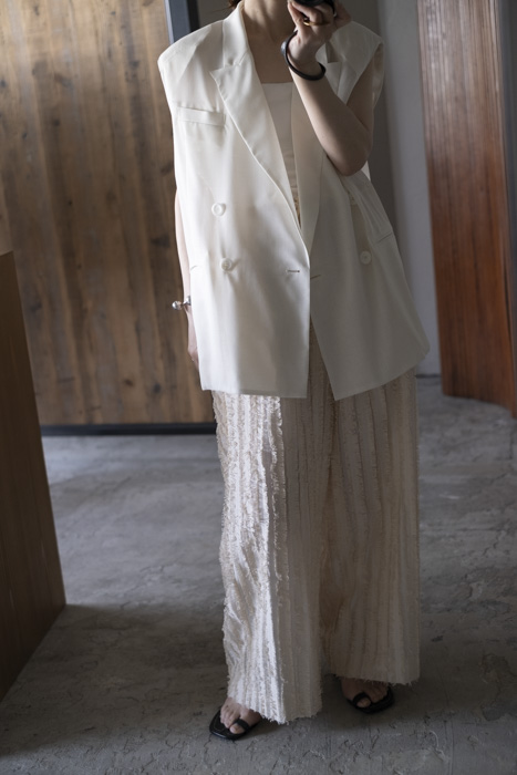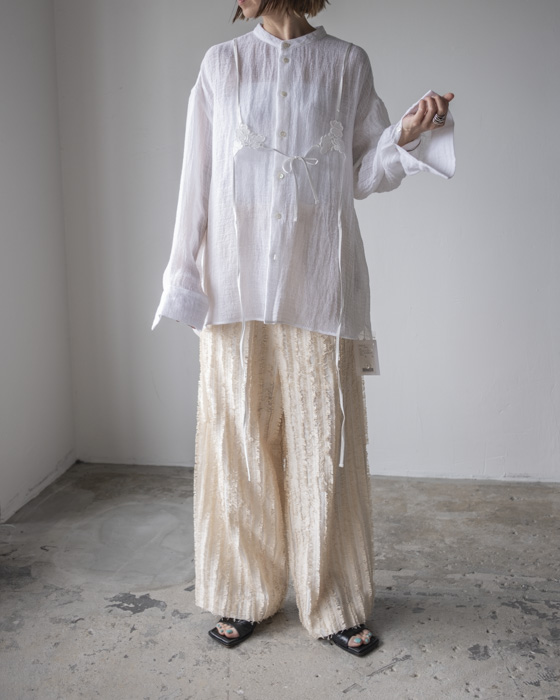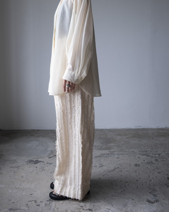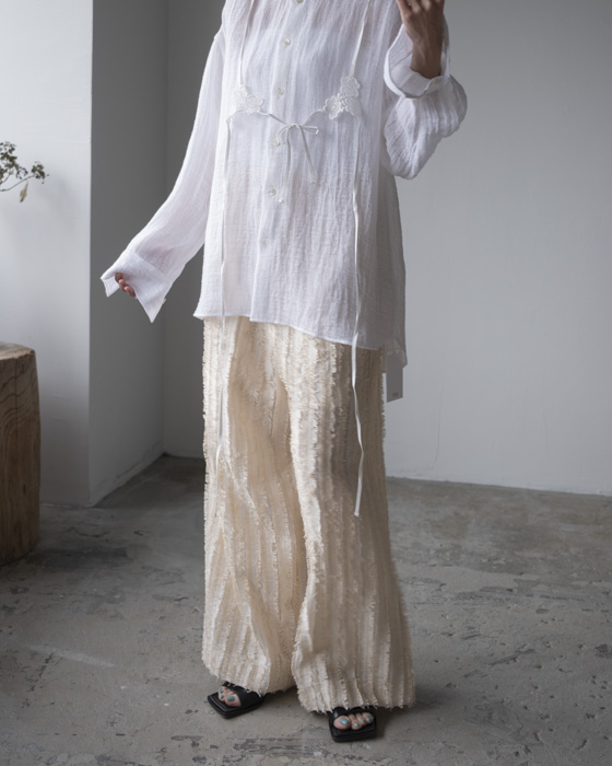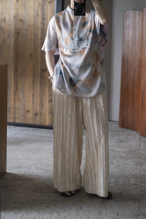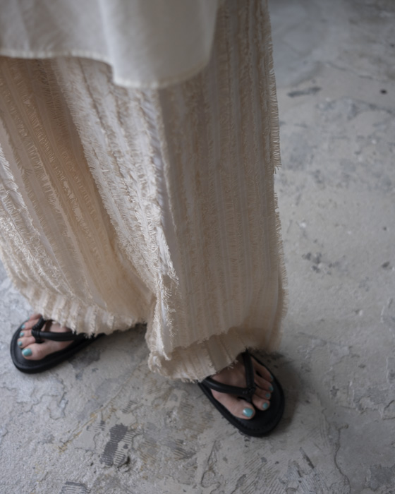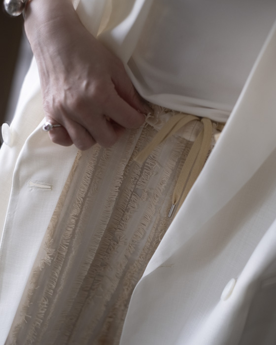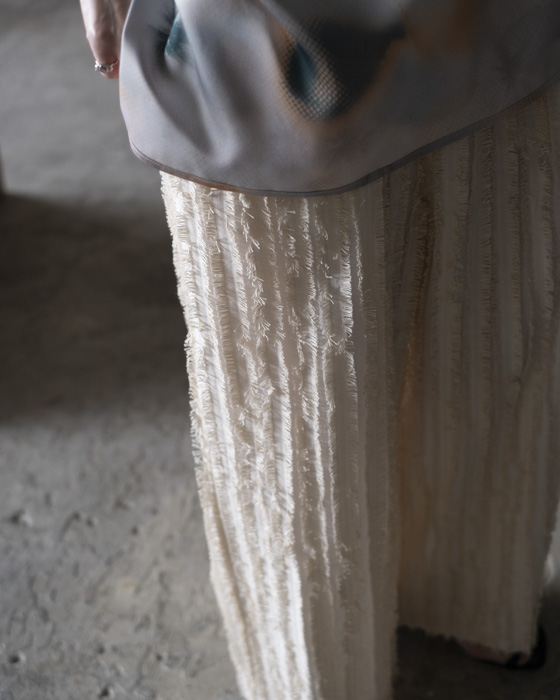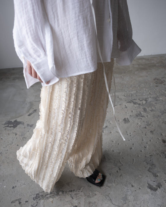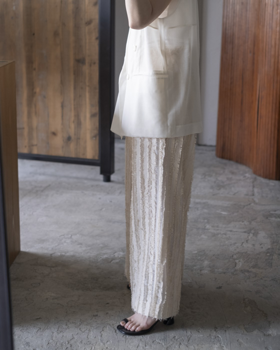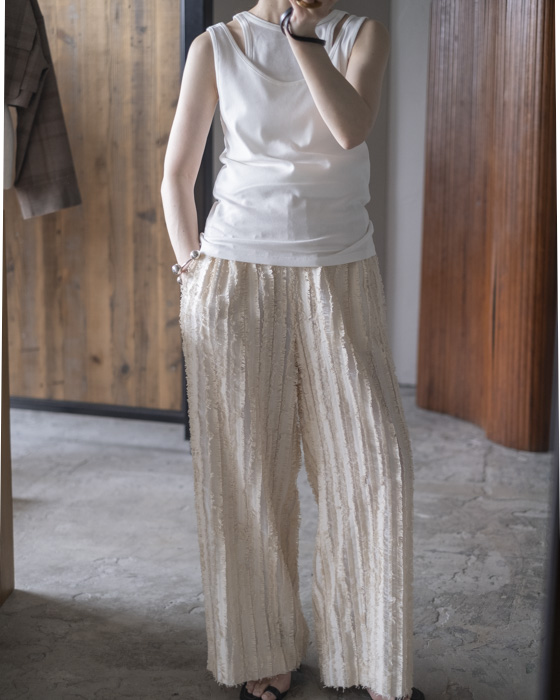 キュプラ綿のベース生地に擬麻加工(麻のような風合いに仕上げる加工)をした綿糸を織り込み仕上げた、カットジャガード素材。風合いが特徴的でシンプルなトップスに合わせるだけでも素材感あるボトムスです。